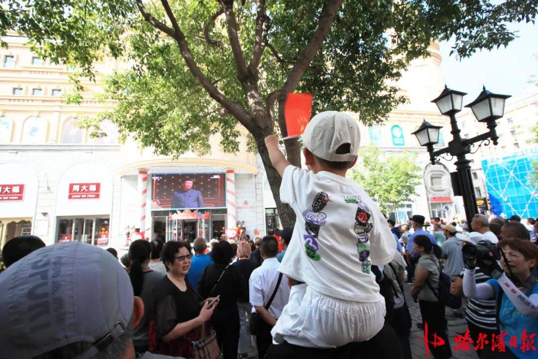 3日8时许,在中央大街中央商城门前,早早就聚集起了在此等待一起观看阅兵的市民游客。当国歌奏响,大家也都情不自禁地随之合唱。检阅开始,有人肃然而立,有人则静静地拿起手机,拍摄下这激动人心的时刻。哈尔滨中央商城总经理徐卫国告诉记者,这次活动告诉我们要铭记历史、缅怀先烈,也提醒我们每一个人坚守好自己的岗位,为国家强盛做出自己的贡献。市民王继辉和伙伴们自费买来200面国旗,发放给在现场的市民游客。王继辉说,看了阅兵之后他内心非常激动,“希望祖国越来越好,也希望更多国内外游客来哈,感受冰城的独特魅力!”