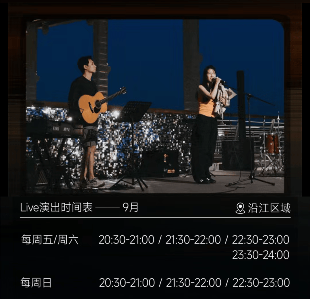 即日起至10月8日,每周五至周日,Gate M 西岸梦中心多家商户营业至24:00(部分至次日2:00)。每周五/周六/周日20:30开始,沿江区域Live演出热力开唱。
