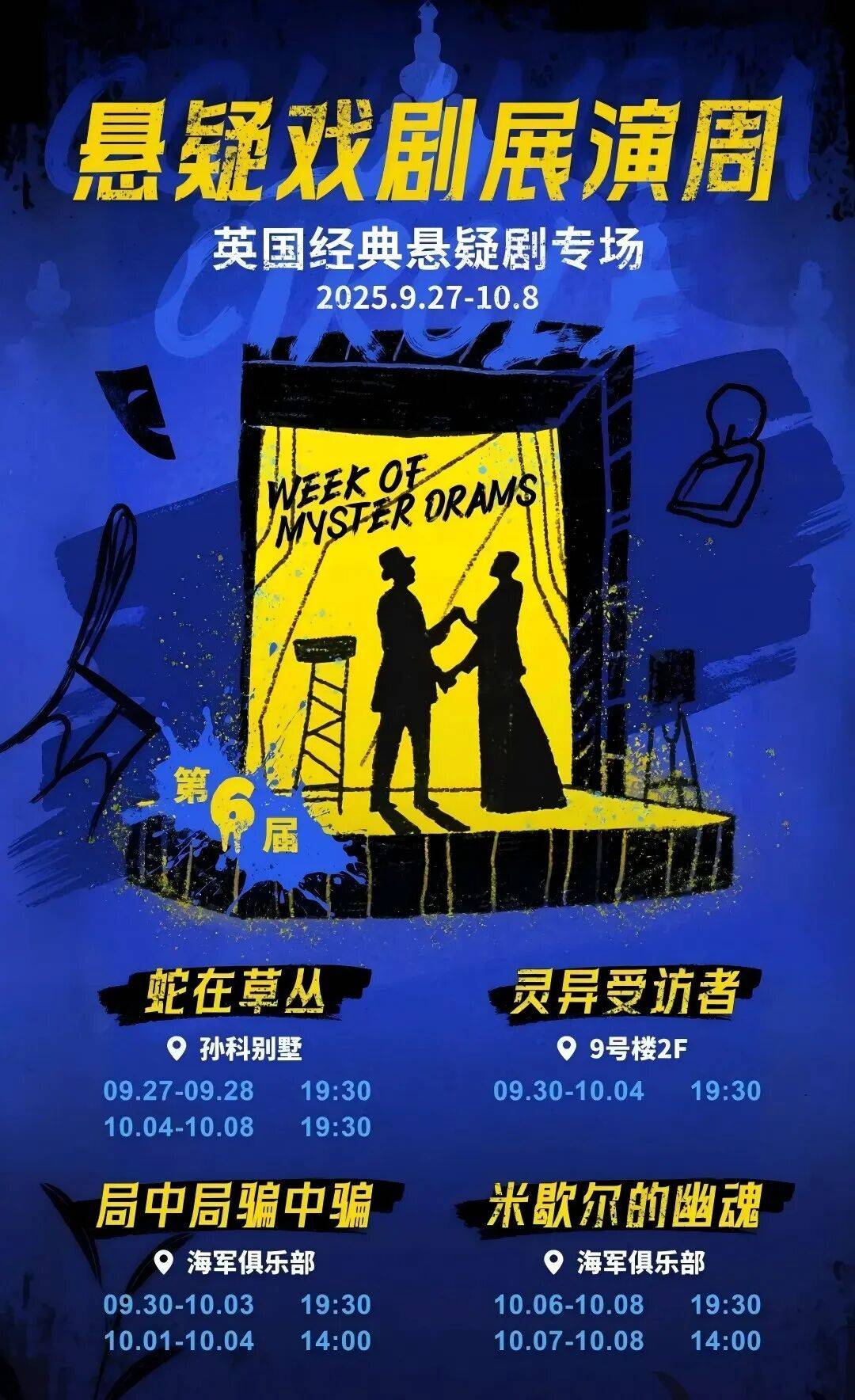 上生·新所第六届悬疑戏剧展演周开演啦!今年直接把伦敦西区的“尖叫感”搬来,《蛇在草丛》《米歇尔的幽魂》等四部英剧连番上,还在孙科别墅、海军俱乐部这些老建筑里演,沉浸式悬疑体验直接拉满~
