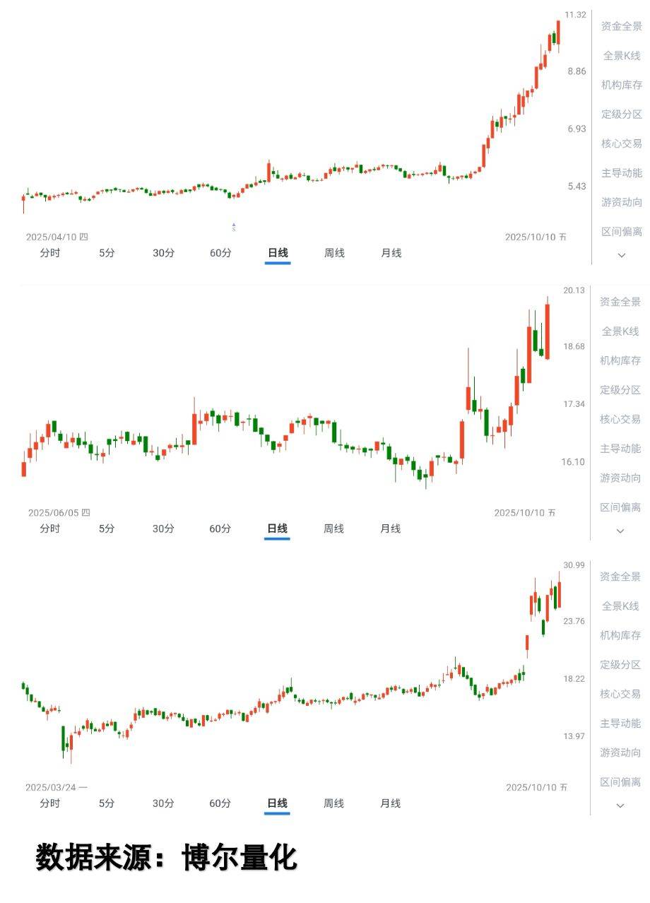 但它们都有一个共同点:在2025年二季度开始横盘震荡,9月下旬突然启动暴涨行情。表面看是旱地拔葱,实则早有征兆。