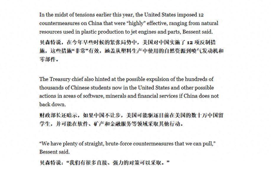 华体会,华体会体育官网,华体会体育APP下载/华体会体育[永久网址:363050.com]平台是一家专注于体育娱乐的领先平台。华体会专注体育竞技,华体会app提供实时体育赛事、华体会棋牌、华体会彩票、华体会百家乐、华体会APP,华体会官网,华体会官方网站,华体会网址,华体会登陆链接,华体会平台,华体会官方平台,华体会app下载,华体会体育靠谱吗,华体会2025最新,华体会世界杯,华体会体育打造安全便捷的互动娱乐平台,体验最好的赛事服务。10月13日,美国财政部长贝森特在一次采访里,把中国对稀土和关键矿产的出口管控描述为“与全世界对抗”,并且特意提到美国境内有30万到40万名中国留学生,把他们当作一种“筹码”来暗示可能的报复手段。话说得含糊其辞,但抛出的弦外之音很清楚:如果中国不让步,美国有可能对这些留学生采取强硬措施——这让人联想到驱逐或施压的可能性。