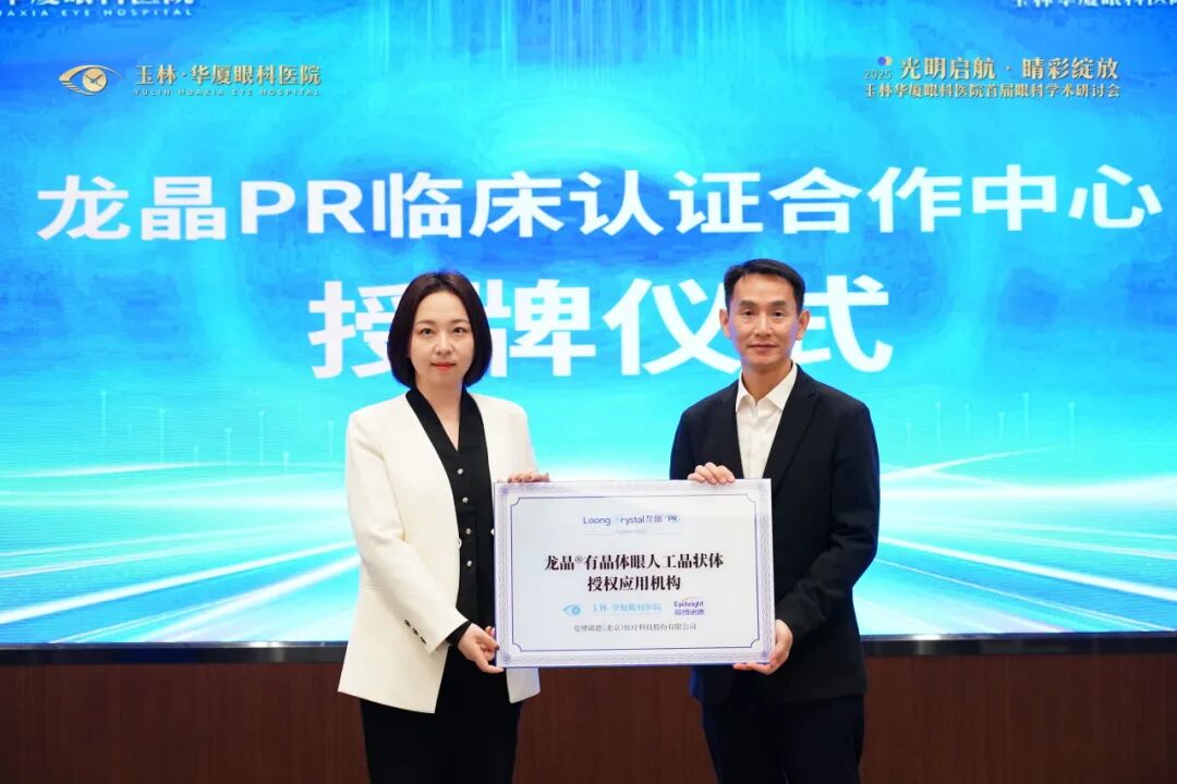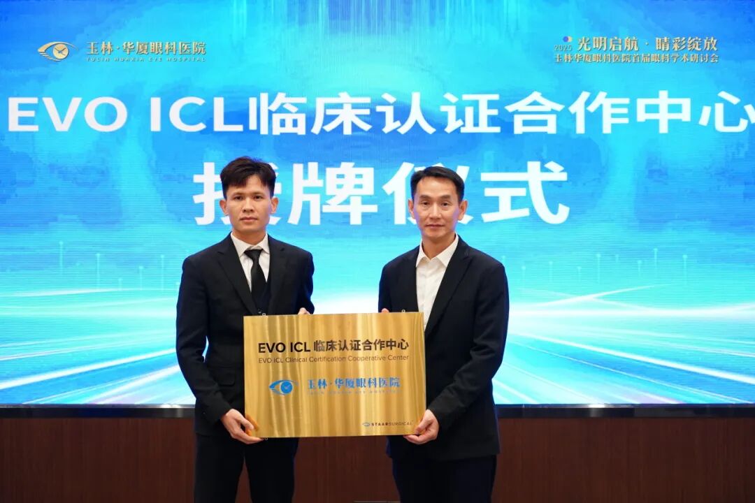 在全体与会专家的共同见证下,现场隆重举行了“EVO ICL临床认证合作中心”和“龙晶有晶体眼人工晶状体授权应用机构”两项授牌仪式。这两大官方权威认证不仅标志着玉林华厦眼科医院在屈光诊疗领域的技术实力获得充分肯定,更将推动桂东南地区眼科医疗服务能力的全面提升,为不同年龄段和需求的屈光不正患者带来更安全、更精准、更个性化的矫治方案,让先进眼科技术更好地惠及广大民众。