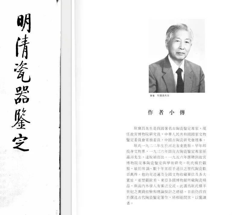 在故宫一甲子的岁月里,先生以“胎为骨,釉为衣”为鉴瓷核心,提炼出造型、纹饰、胎釉、款识“四维一体”鉴定体系。1993年,故宫博物院紫禁城出版社出版了耿宝昌先生的《明清瓷器鉴定》一书,此为先生半个多世纪的实践经验与理论探讨的总结,集学术性、实用性与权威性于一书,是20世纪中国文物鉴定界学术征途中的一个里程碑,洋洋60余万言,近6万幅图,无不是耿老的殷殷心血,其后又不断补充修订,精益求精——这部被业界奉为“圣经”的巨著,至今仍是全球藏家人手一册的入门指南。