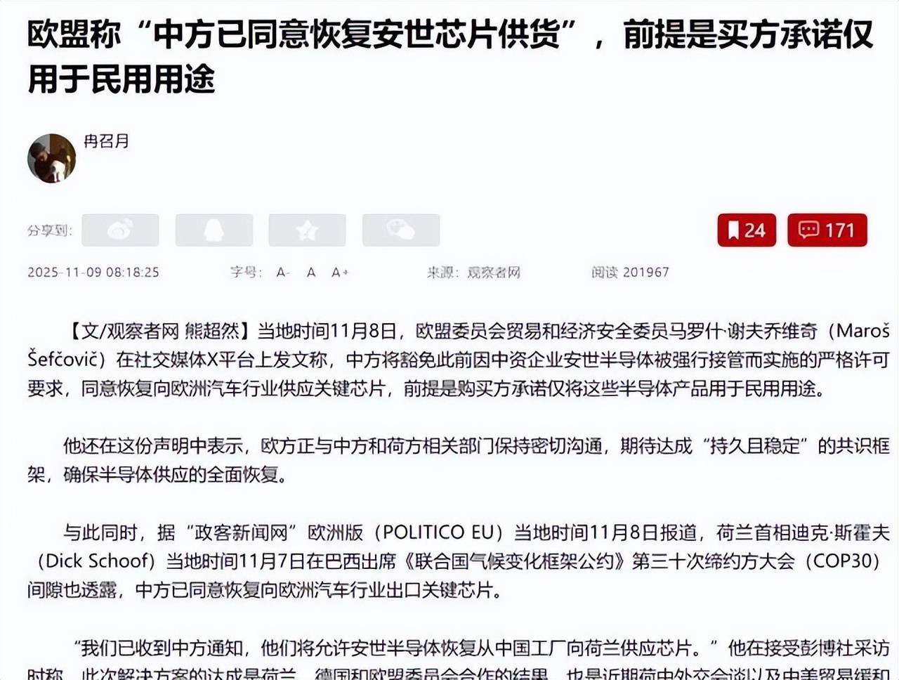 经过一个月的僵持,荷兰政府终于感受到了压力。全球主要汽车制造商,如大众、沃尔沃和尼桑,纷纷表示芯片短缺可能导致生产线停摆。德国经济部发言人表示,这一问题威胁到德国车企的生产。荷兰议会的议员们也开始对政府的干预措施表示质疑,要求经济部长解释干预的必要性。压力越来越大,荷兰总理迪克·肖夫在与布鲁塞尔的会谈后表示,中国同意恢复部分芯片的交付,荷兰方面主动联系中国,表示愿意停止接管安世半导体,并派遣官员前往中国进行谈判。