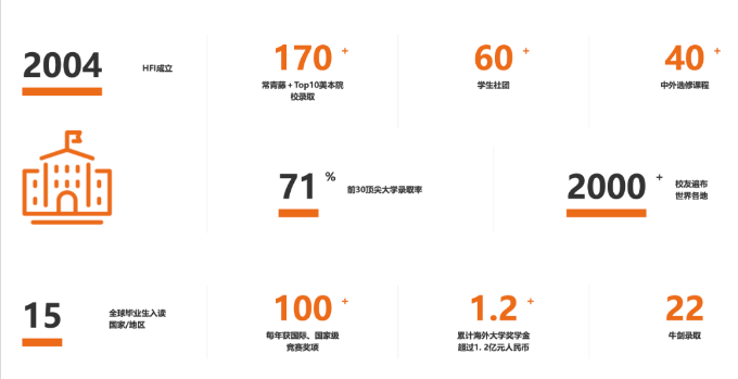 自办学以来,华附国际部升学成绩一直都非常亮眼!已培养出超过2000名毕业生(含IFY英澳预科项目),毕业生遍布全球15个国家和地区,其中HFI历届毕业生100%被世界名校录取,93%被美国前50的综合性大学录取,20%的同学被美国前20综合性大学录取,超过170人次获得美国藤校+TOP10院校(本科级别)录取。
