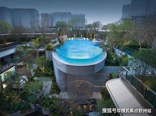 配置近 700㎡梵高星空无边际泳池,270° 高空瞰景,搭配 150 米景观中轴、悬挑贝壳亭等景观节点,生活即度假。
