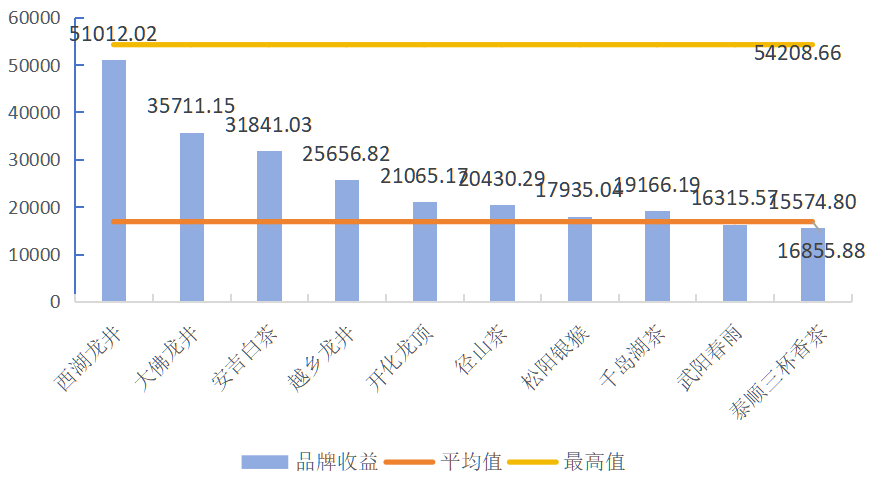 图4 浙江省内茶叶区域公用品牌收益前10位的品牌收益、平均值、最高值比较