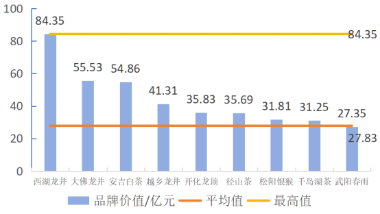 图2“浙江省内绿茶品牌价值前10与茶类平均值、最高值比较同时说明,与浙江省境内的所有茶叶区域公用品牌进行品牌价值比较可见,大佛龙井的品牌价值虽然与西湖龙井尚存较大距离,但与除了安吉白茶这个特殊的绿茶品牌之外的浙江绿茶区域公用品牌比较,已经奠定了稳固的地位。