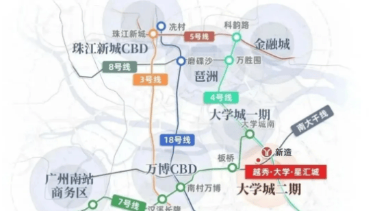 越秀大学星汇城坐落于国际创新城新造板块的核心区域,地处琶洲以南,占据板块发展的核心优势位置。国际创新城作为广州重点发展的板块之一,依托大学城的科教资源与琶洲的产业资源,发展潜力巨大,未来将成为集科技创新、教育科研、居住生活于一体的综合性板块,项目也将直接受益于板块的发展红利。