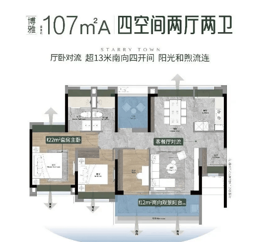【107㎡A 4空间2厅2卫】:四房设计,4.5开间朝南,客厅与主卧双南北对流,采光和通风效果达到最佳。客厅空间宽敞,可满足家庭日常娱乐与接待客人的需求;主卧为套间设计,配备独立卫生间和衣帽间,保障了主人的私密性与居住舒适度;其余卧室空间大小适中,可根据家庭需求改造为儿童房、书房、老人房等,灵活性强。