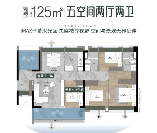 【125㎡ 5空间2厅2卫】:五房设计,4.5开间朝南,客餐厅南北对流,空间宽敞明亮。该户型适合人口较多的家庭居住,五个房间可灵活布局,满足家庭成员的不同需求;客餐厅一体化设计,拓展了活动空间,让家庭互动更加便捷;大阳台设计,不仅提升了采光和通风效果,还为业主提供了观景、休闲、晾晒的多功能空间;多个飘窗设计,增加了室内使用面积,也为居者提供了舒适的阅读和观景角落。