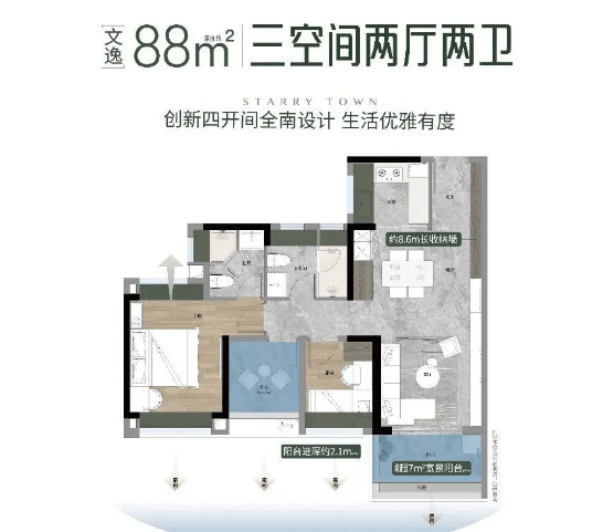 【88㎡ 3空间2厅2卫】:该户型为三房设计,三卧室朝南,拥有超11米的景观线,采光充足,通风效果极佳。户型布局紧凑合理,空间利用率高,没有浪费面积;客厅连接景观阳台,拓展了室内空间视野,同时也为日常晾晒和休闲提供了充足空间;两个卫生间的设计,满足了多人口家庭的使用需求,避免了早晚使用高峰的拥挤问题,提升了居住的舒适度。