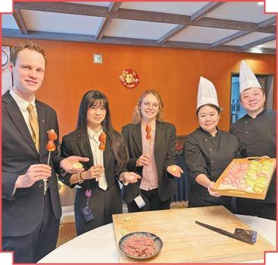 中企新海航布鲁塞尔唐拉雅秀酒店中外籍员工一起制作中国传统美食。本报记者 牛瑞飞摄