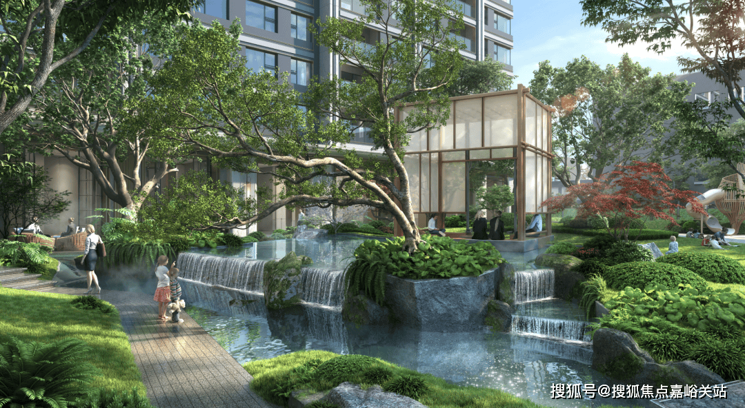 ,最后将社区约300㎡的水景区域,科学划分为5个相互呼应的独立模块,并分别配备循环系统,结合业主每天的生活场景,规划不同模块水系开放时间。水景不应是摆设,而应吸引人们长时间地驻足、休憩、嬉戏,让粼粼波光与生活相随。